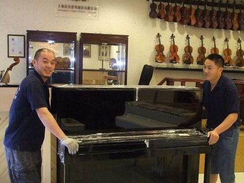 3、搬运钢琴有技巧,如果钢琴需要搬运上楼,需派四至五人搬运,两人在下,三人在上,用宽布带挎在肩上兜住钢琴的车脚。同时用手抓住琴背的把手和键盘底下(不能拉钢琴的腿),抬起钢琴一鼓作气搬上一层楼再休息。特别要注意的是,键盘的一侧不能碰扶手,车脚不能碰楼梯。到一层楼面拐弯时要当心碰撞、调整好方向然后再抬起往上搬。进房门时,也要当心蹭着门框,保证最后安全地把钢琴放到安排好的位置上。若需把钢琴搬运上厢式货车,由于立式钢琴的重心靠近后背,琴后背的人数要比琴前的人多,往车上抬时,前面三个人,后面两个人,后面的人抬起顶住,前面的人抬钢琴的底部,抬起放到车上,然后上去一个人往车箱上拉,后面的人往车箱内推,这样就能把琴搬上车了。